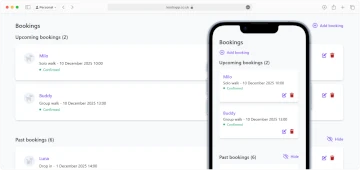 Leadr's booking dashboard gives you a clear overview of all your upcoming and past bookings. Quickly scan walk durations, service types, start times, clients, and pets - all in a single organised list.